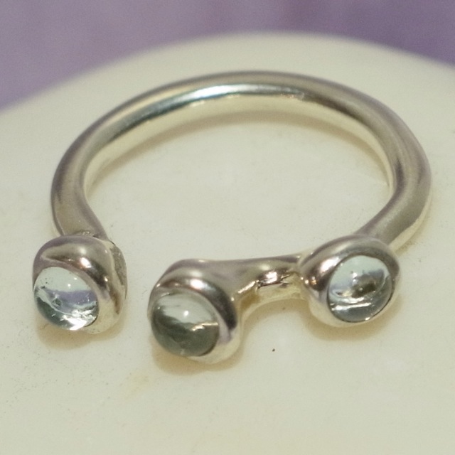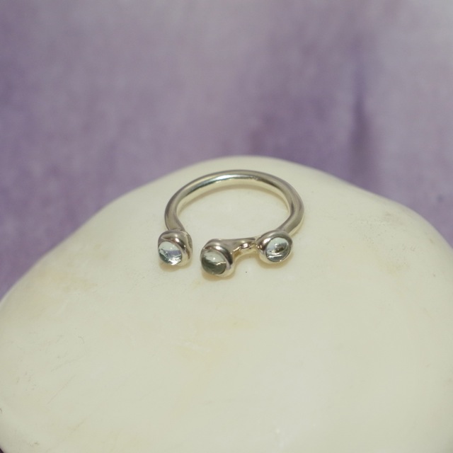 淡い水色の天然ブルートパーズストーンを3つ使用した、フロントオープンタイプのシルバーリングです。
