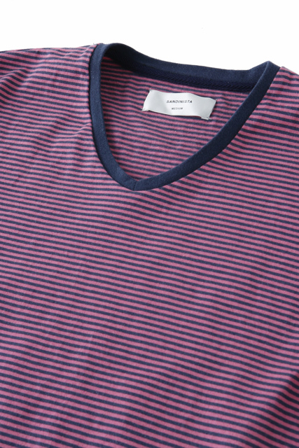 細かいオリジナルボーダー生地を使用したVネックTシャツです。製品後にフロスト加工を施していますので、独特な風合いが出ています。