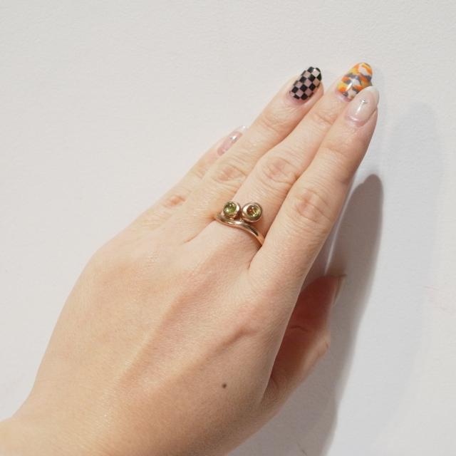天然のぷっくりしたペリドットストーンを2個使用したブロンズ製のリングで、リング自体が滑らかな曲線になっており女性らしい印象です。