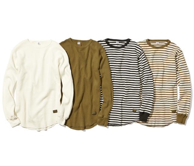 ダブルメッシュサーマルで着膨れがなくスッキリとした印象になるワッフルクルーです。オリジナルの編み立てリブを使用しております。