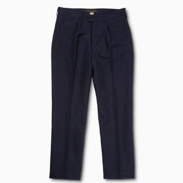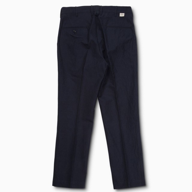 色の糸を使用して織り上げたオリジナルコットンラミー素材。ムラ感の少ないラミーを使用した清涼感ある素材が特徴。ビンテージのサファリパンツをイメージソースに現代的に再構築しています。