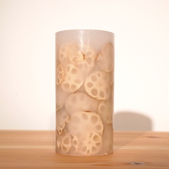 全体が鑞で出来ているキャンドルです。実際の植物や果物を職人の手仕事でキャンドルの外側に配列しています。1つ1つが職人の一貫作業で製作しています。素材選定、製法、品質すべてに調和をへの想いを込めて1つ1つ手作りしています。