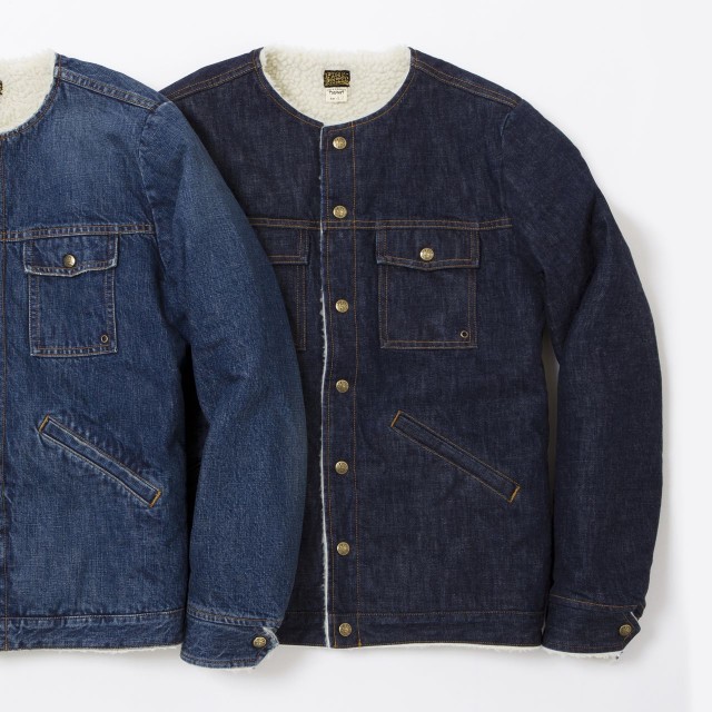 ノーカラーデニムジャケットでインナーボア仕様です。ピッグアンドルースターの代表作ノーカラーデニムシャツをアップデート。