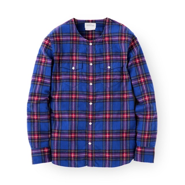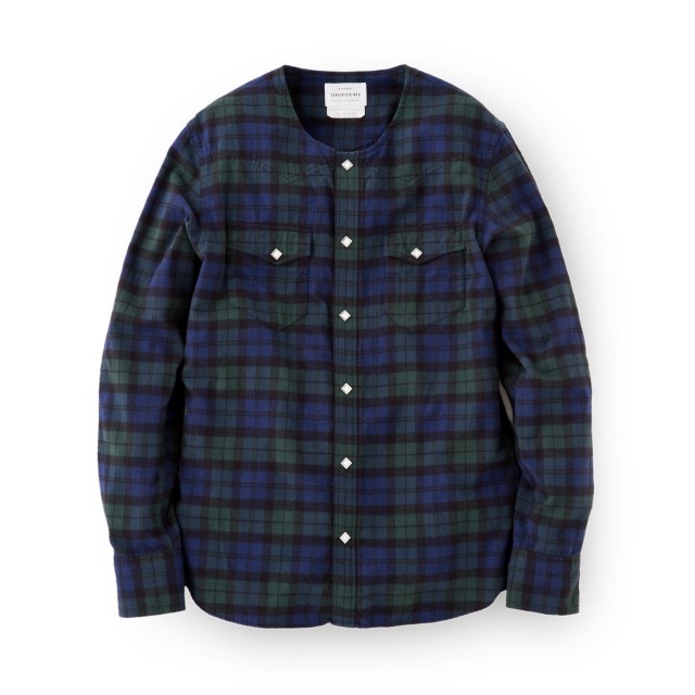 フランネル生地を使用して、ウエスタンシャツをベースとしたノーカラーシャツです。
