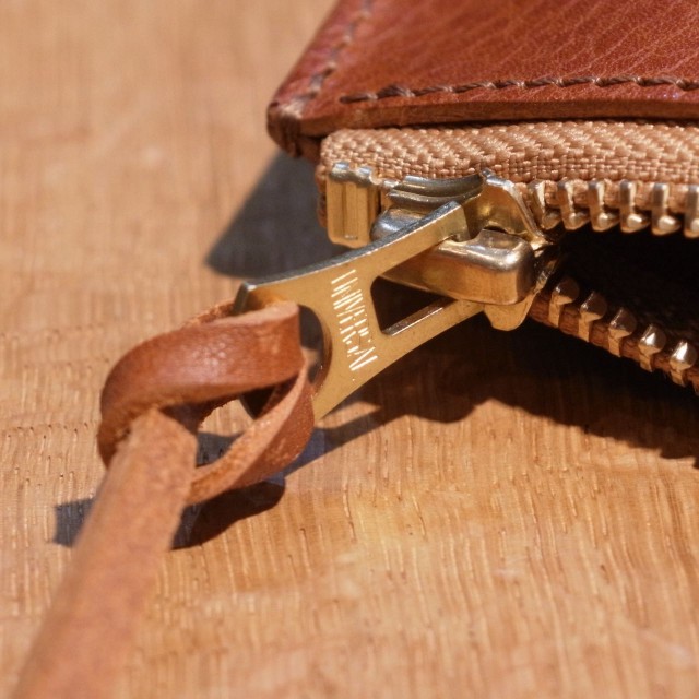 ジップはUNIVERSAL製のジップを使用、革紐の引き手付きです。フロントにはロゴプリント入り。
