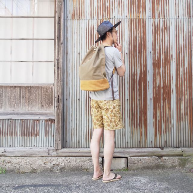 キャンバス素材とスエード素材を組み合わせたバッグパックです。底の部分とショルダーストラップにスエードを使用しています。開閉部分が金具付きドローコードで、開ける際に大きく開く事ができます。また円柱状の作りで幅のある大きな物も入ります。中生地はシュペリオールレイバーオリジナルのカモ柄ファブリック仕様。