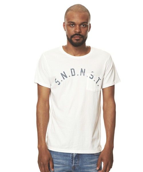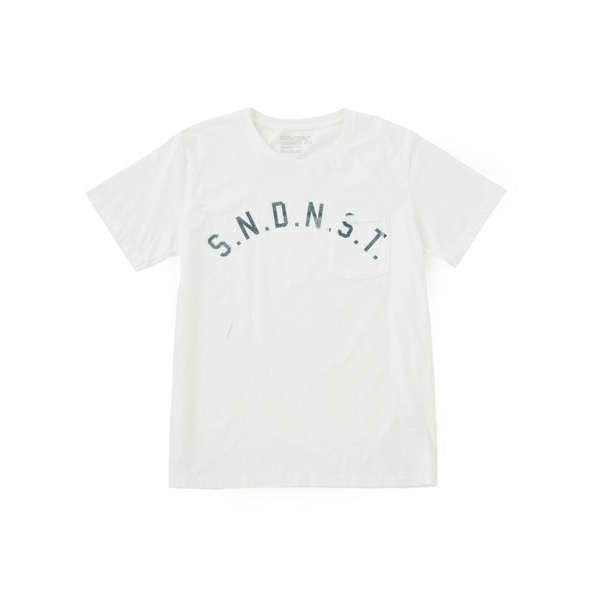 SNDNSTのプリントをアーチ状に胸ポケット上から、かすれプリントしたシンプルでコーディネートしやすいTシャツです。