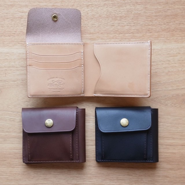 外側に付いたコインポケットを覆うようにフラップを付けることにより、二つ折りの本体が開く仕様になっております。