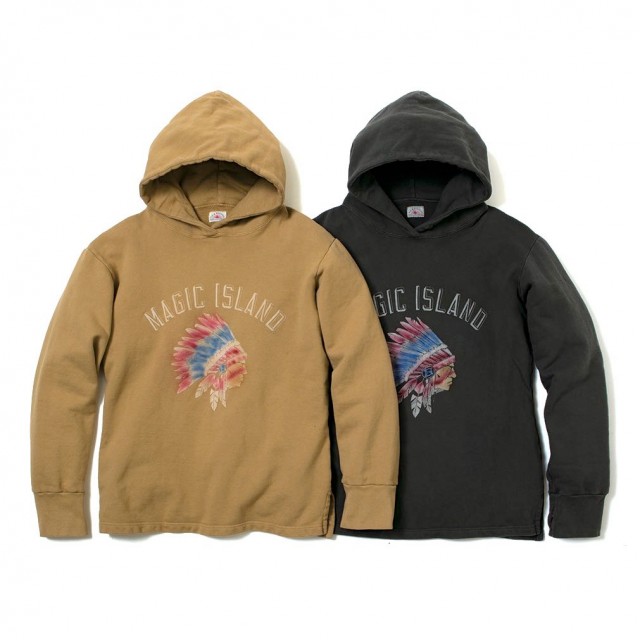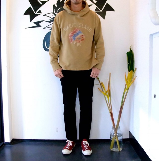 P&Rがオリジナルファブリックを製作したフードスパーカです。製品後にオーバーダイ加工を施しています。またフロントのプリントにはフロッキングプリントを用いており立体的な質感があります。実はフロントプリントの色付けには、一点一点職人が細かな手作業で吹き付けの色付けをしています。