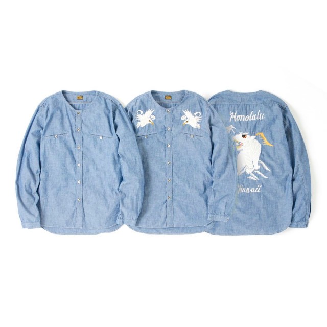 P&Rが得意とするノーカラータイプのシャツです。今回はスカジャン等に刺繍されるグラフィックを花井祐介氏に依頼しました。