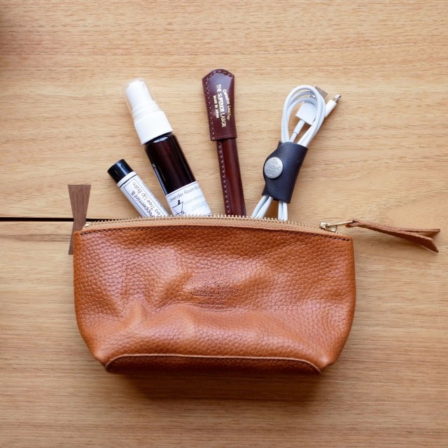 筆記用具や生活雑貨、携帯やキーケース等々、日頃持ち運ぶ際に嵩張ってしまうモノを収納し易いポーチです。鞄の中や車の中に置いておく事も良いですが、手で持ち歩いても型の良いレザーポーチです。