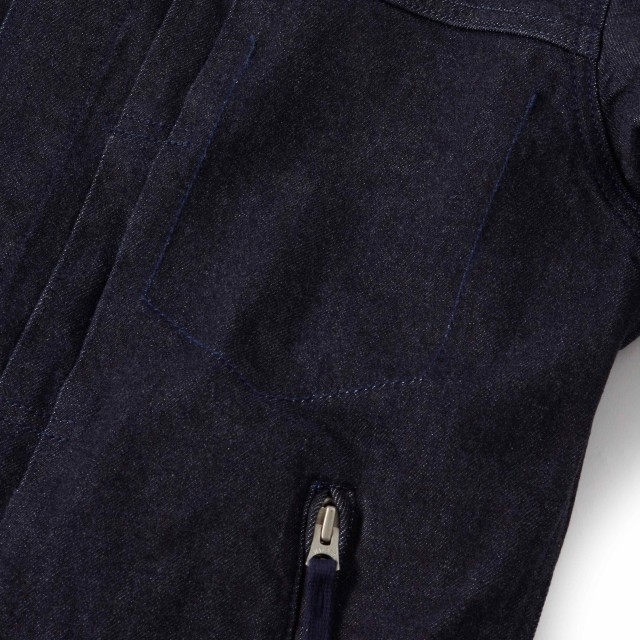 今回の特徴は素材のみではなく、デニムジャケットには珍しい同色ステッチを使用する事で、スッキリとした印象になっているのも特徴です。通常のオレンジやイエローのステッチの物と並べると印象が全く違います!