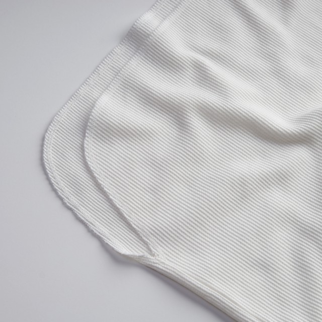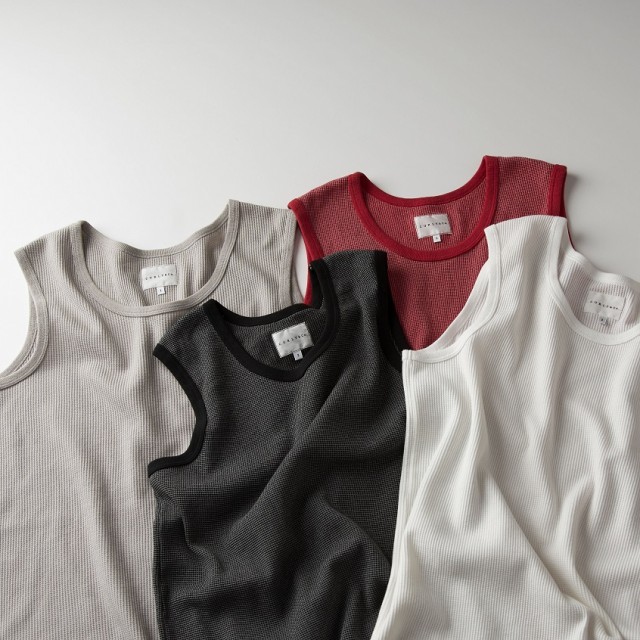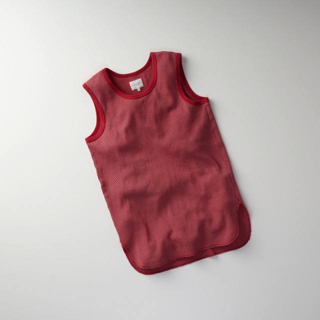 通常のタンクトップより肩幅を広めに取る事で着易くアレンジしたシルエット。表側は鹿の子のようにして表情を付け、肌側はフラットな編地にして肌触りを良くしている。