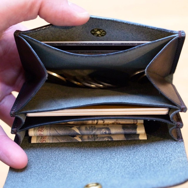 インナーは、中サイズのカードポケットが2ヶ所、大きく開くコインポケットが1ヶ所、小さなカードケースが1ヶ所の全4ポケットで構成しています。