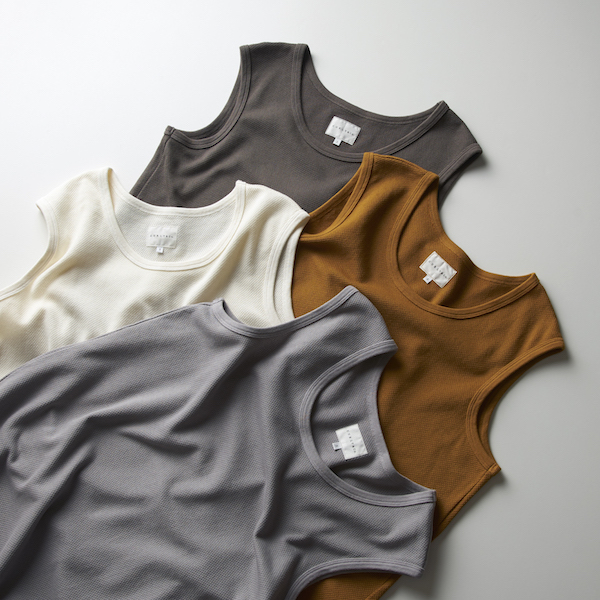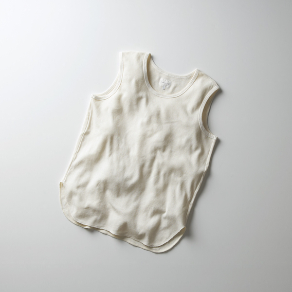 通常のタンクトップより肩幅を広めに取る事で着易くアレンジしたシルエットです。