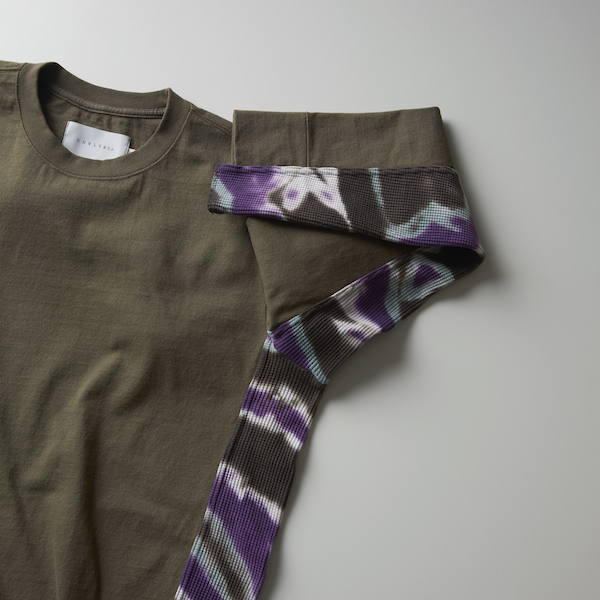 太番手の糸でしっかりと編まれた生地に注染で染め上げたワッフル素材を切り替えることで1枚着でもポイントになるデザインです。