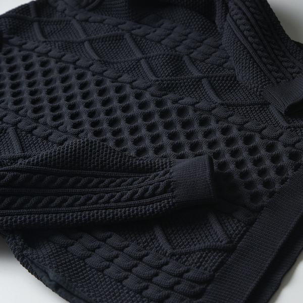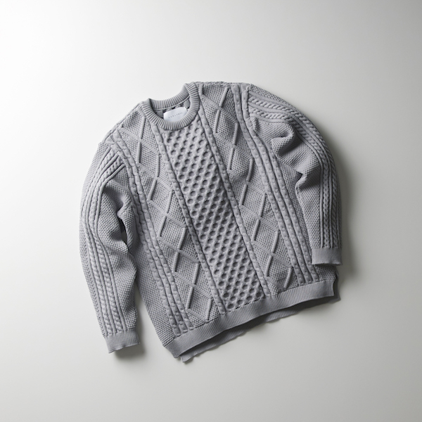 編み立てた後に収縮する糸を使い、存在感ある立体的な柄を表現しています。