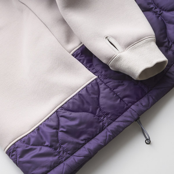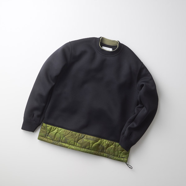 裾にはミリタリーのライナージャケットをモチーフに作成したキルティングで切り替え、1枚着はもちろんレイヤードした時にもアクセントになるデザインです。
