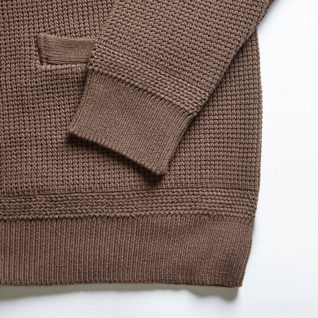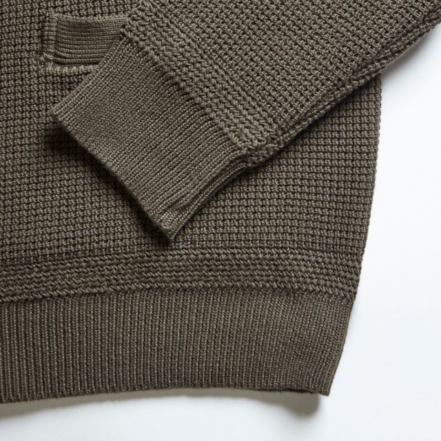 ウールに比べケアに気を使う必要がなく、ニット編みの為スウェットシャツよりも高い保温性を持ちます。