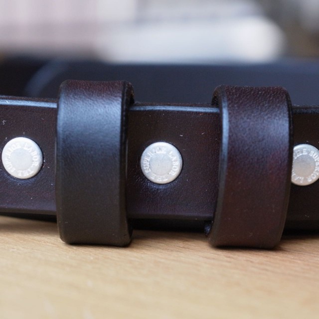 アメリカのハーマンオーク社製の38mmヌメ革を1点1点手染めにより革への着色を行っていますので、1点1点ごとに色味の味わい温もりがあります。