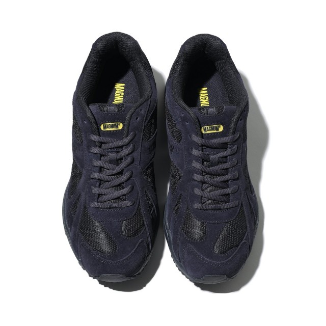 アッパーにはキメの細かい本革スエードを贅沢に使用してダークトーンのネイビーでシックな仕上がりにしつつ、エンブレムとインソールに配した鮮やかなイエローがコーディネートのアクセントに。