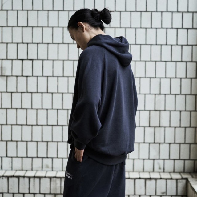 旧式の編機を使用することで、通常よりも空気を含む裏毛特有のバルキーな質感が特徴のプルオーバーパーカーです。