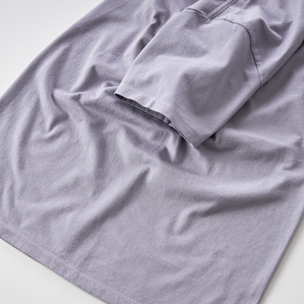 素材には超長綿の右撚り糸を左撚り糸で覆うことでねじれが相殺される2層構造の糸を使用。