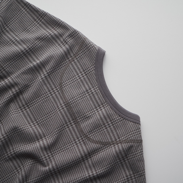 チェック柄を落ち着いたトーンで表現することで、無地感覚でコーディネイトに取り入れることができます。